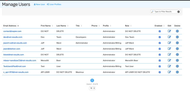 To disable a user, hover over your email in the upper right-hand corner, go to “Administration” and then “Manage Users”. Once on that page, you’ll want to uncheck the enabled box by the username! This will revoke access to Net-Results for this user.